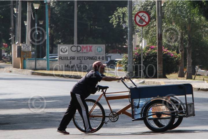 Un hombre empuja un triciclo cargado de garrafones de agua, sobre Calzada de la Virgen.