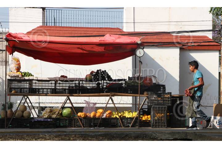 Comerciante alista su puesto para la venta de fruta, sobre Avenida Escuela Naval.