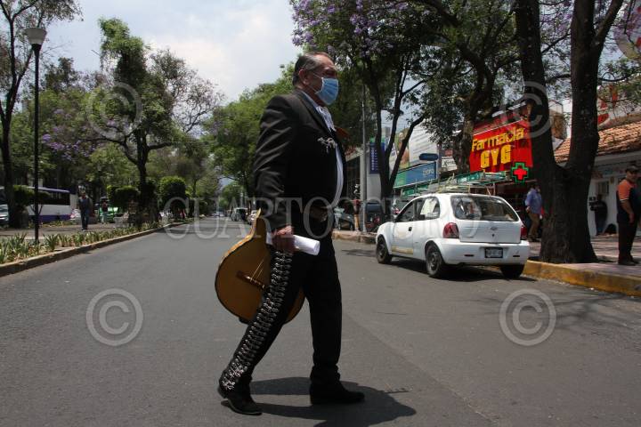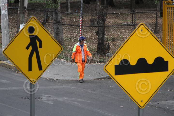 Trabajador del gobierno recorre las calles de Coapa con cubrebocas como medida preventiva ante el COVId-19.