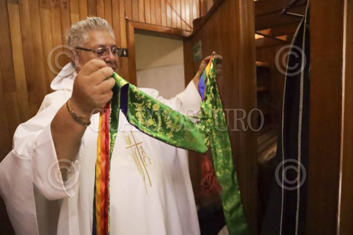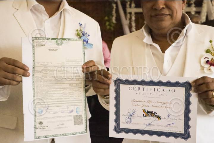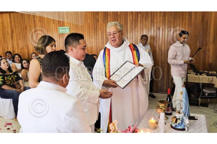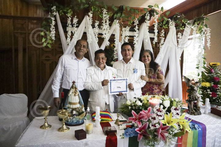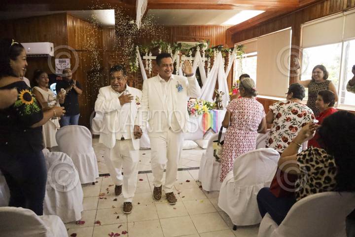 TAPACHULA, CHIAPAS, 17SEPTIEMBRE2024.- Rosenberg López Samayoa, activista de la comunidad LGBTIQ+, celebró su boda religiosa con su pareja Carlos Mendoza. Considera que además de ser un momento especial piensa que darla a conocer a la comunidad en general ayudará a derribar las barreras de discriminación. Ya que señala que actualmente las bodas entre personas del mismo sexo están plenamente avaladas por la SCJN, en Chiapas no se cumple con esta ley en los registros civiles. La unión estuvo avalada por el reverendo Antonio Nevarez, pastor de Caminando Juntos Misión Cd. Juárez, Chihuahua (ICM), y fue presenciada por amigos y familiares que les desearon lo mejora a la pareja. FOTO: DAMIÁN SÁNCHEZ/CUARTOSCURO.COM