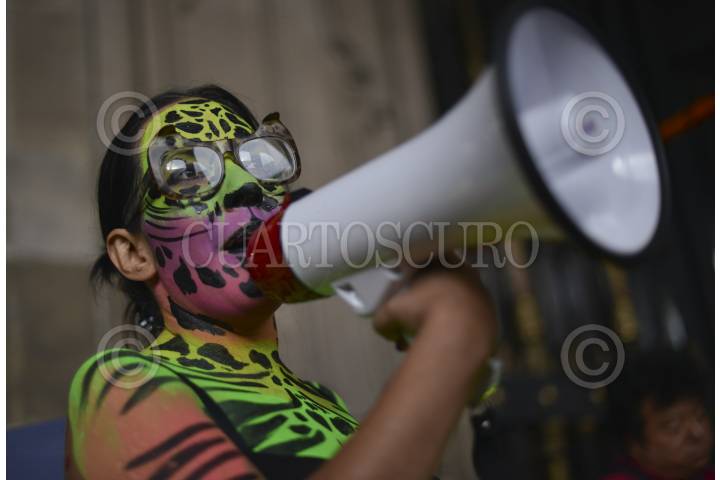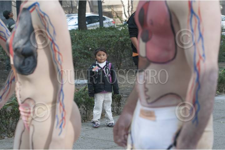 MÉXICO, D.F., 16ENERO2013.- Con desnudes y pintura corporal, organizaciones civiles como: La Red por los Derechos de la Infancia, Bicitekas, Red Nacional de Ciclismo Urbano y El Poder del Consumidor; iniciaron una campaña pública de información sobre el aumento de enfermedades respiratorias y cardiovasculares por respirar aire contaminado diariamente. Según informaron los organizadores, el aire contaminado sigue causando la muerte de 14,700 mexicanos cada año, de acuerdo con la OMS, por eso la necesidad de tener y perseguir los límites de contaminantes en la ciudad. FOTO: DIEGO SIMÓN SÁNCHEZ /CUARTOSCURO.COM