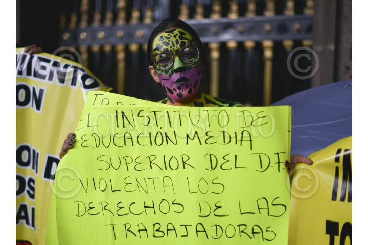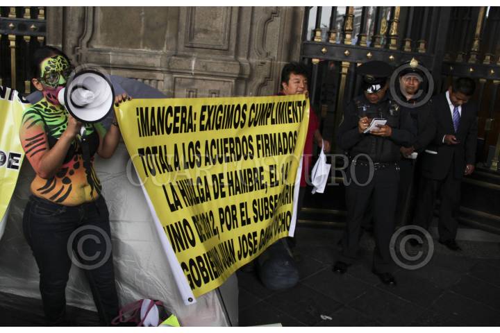MÉXICO, D.F, 29AGOSTO2013.- María Fernanda Calderón Avalos, maestra universitaria quien había mantenido una huelga de hambre hace algunos meses, nuevamente se manifestó, ahora con maquillaje corporal a las puertas del gobierno capitalino para demandar a las autoridades cumplan los acuerdos firmados en aquella fecha y así la reinstalen en su empleo. FOTO: ADOLFO VLADIMIR /CUARTOSCURO.COM