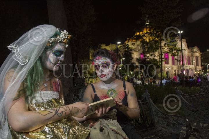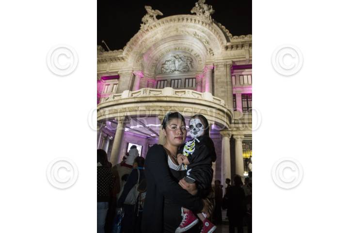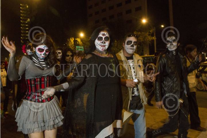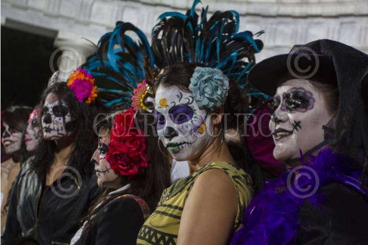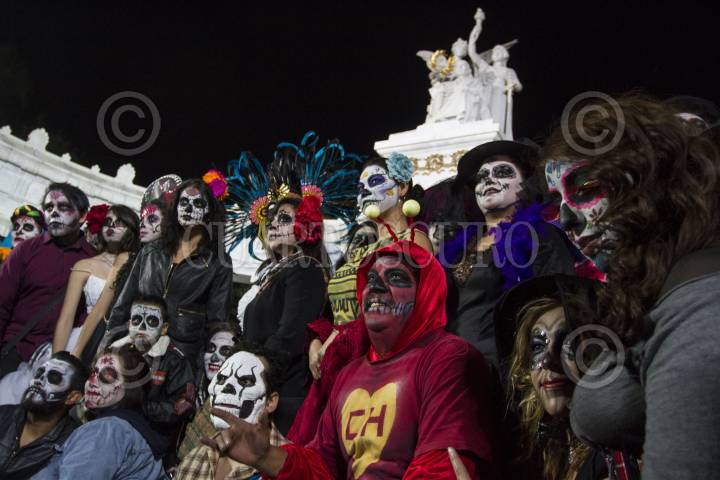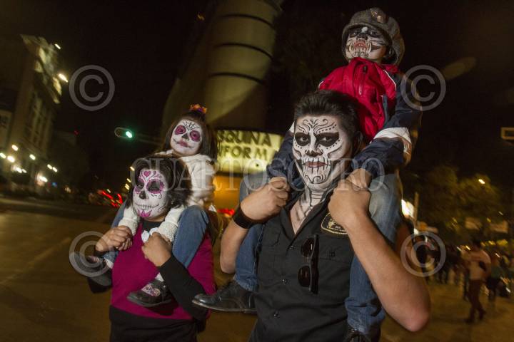 MÉXICO, D.F., 26OCTUBRE2014.- Alrededor de 200 personas caracterizadas como Catrinas desfilaron por avenida Reforma y Juárez, hasta el Palacio de Bellas Artes, como parte de un "Mega Desfile de Body Painting" en el marco del Día de Muertos. FOTO: ISAAC ESQUIVEL /CUARTOSCURO.COM