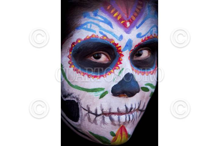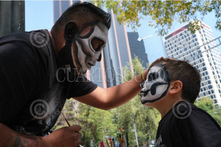 CIUDAD DE MÉXICO, 13OCTUBRE2019.- Un joven pinta los rostros de los niños con la temática del Día de Muertos, sobre Paseo de la Reforma. FOTO: GRACIELA LÓPEZ /CUARTOSCURO.COM