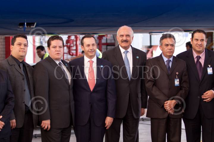 MÉXICO D.F., 08MARZO2012.- Ricardo del Valle, lider de la Asociación Sindical de Sobrecargos de Aviación (ASSA); José Luis Barraza, presidente del consejo de administración de Aeroméxico y Andrés Conesa, director general de Aeroméxico durante la entrega de un avión Boeing 787 Dreamliner parte de una gira mundial de exhibición. Aeroméxico contará con 7 aviones en los próximos años así mismo se anunció el plan comercial de esta aerolínea el cual incluye nuevos destinos, rutas y frecuencias para los mercados nacional e internacional. FOTO: RODOLFO ANGULO /CUARTOSCURO.COM