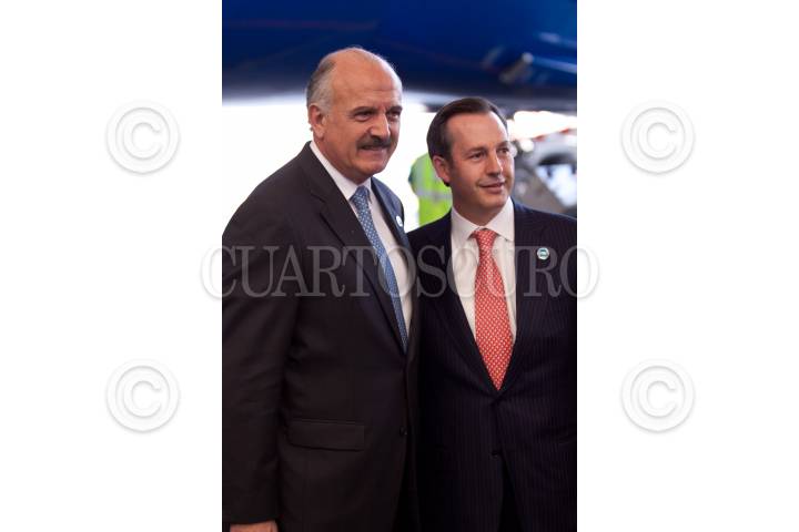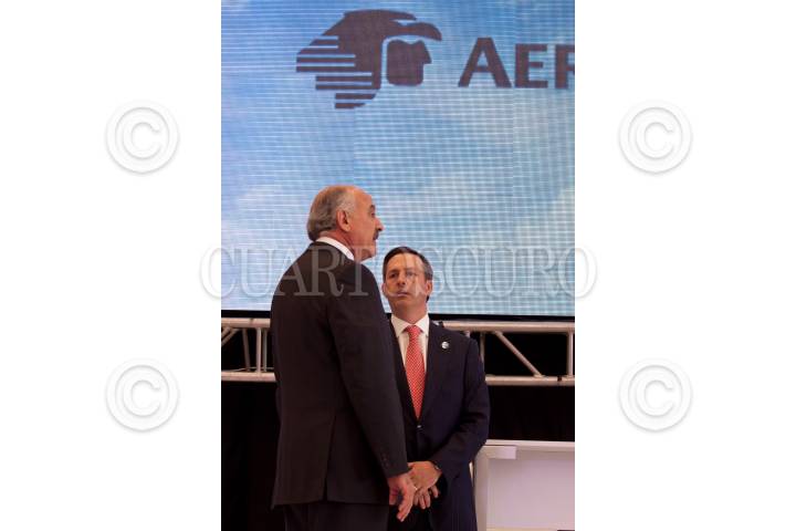 MÉXICO D.F., 08MARZO2012.- José Luis Barraza, presidente del consejo de administración de Aeroméxico acompañado de Andrés Conesa, director general de Aeroméxico durante la entrega de un avión Boeing 787 Dreamliner parte de una gira mundial de exhibición. Aeroméxico contará con 7 aviones en los próximos años así mismo se anunció el plan comercial de esta aerolínea el cual incluye nuevos destinos, rutas y frecuencias para los mercados nacional e internacional. FOTO: RODOLFO ANGULO /CUARTOSCURO.COM