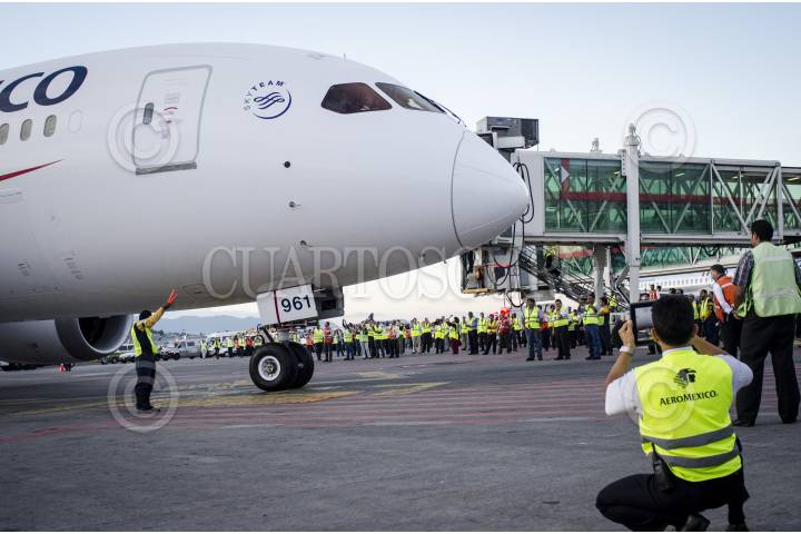 MÉXICO, D.F., 16AGOSTO2013.- Este viernes aterrizó en México el primero de los 19 aviones Boeing 787 Dreamliner; la aeronave de Boeing había causado polémica por fallas en sus baterías. FOTO: MISAEL VALTIERRA / CUARTOSCURO.COM