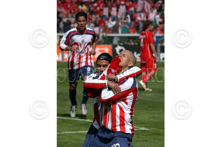 TOLUCA ESTADO DE MÉXICO 10DICIEMBRE2006._ Adolfo el ¨Bofo¨ Bautista feteja la anotación con la que el equipo de las Chivas del Guadalajara derroto con marcador de 2 a 1 al equipo de los Diablos Rojos de Toluca en el estadio Enemesio Diez. FOTO: GUILLERMO PEREA-CUARTOSCURO.COM