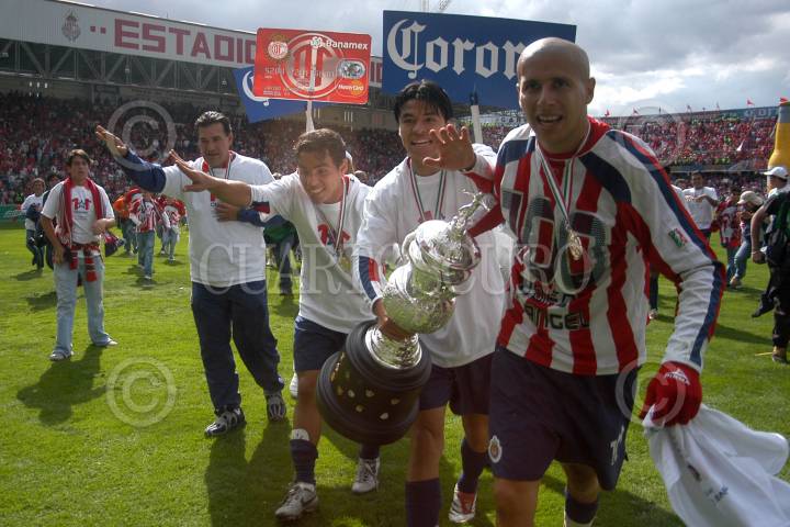 TOLUCA ESTADO DE MÉXICO 10DICIEMBRE2006._ Adolfo el ¨Bofo¨ Bautista festeja con la copa y con sus compañeros, que el equipo de las Chivas se corono campeón tras ganar con marcador de 2 a 1 al equipo de los Diablos Rojos de Toluca en el estadio Enemesio Diez. FOTO: GUILLERMO PEREA / CUARTOSCURO.COM