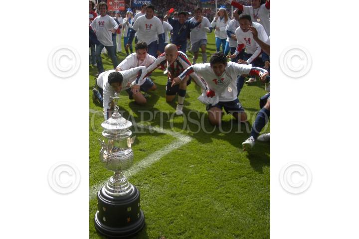 TOLUCA ESTADO DE MÉXICO 10DICIEMBRE2006._ Adolfo el ¨Bofo¨ Bautista festeja con la copa y con sus compañeros, que el equipo de las Chivas se corono campeón tras ganar con marcador de 2 a 1 al equipo de los Diablos Rojos de Toluca en el estadio Enemesio Diez. FOTO: GUILLERMO PEREA /CUARTOSCURO.COM