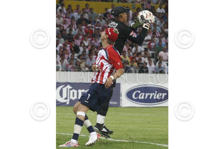 GUADALAJARA, JALISCO, 18ABRIL2007.-El portero de los Tuzos del Pachuca Miguel Calero y Adolfo "El Bofo" Bautista, jugador de las Chivas, durante el juego de ida de la Copa de Campeones 2007 de la CONCACAF que disputaron en contra de las Chivas del Guadalajara. FOTO: JOSE MARÍA MARTINEZ/CUARTOSCURO.COM