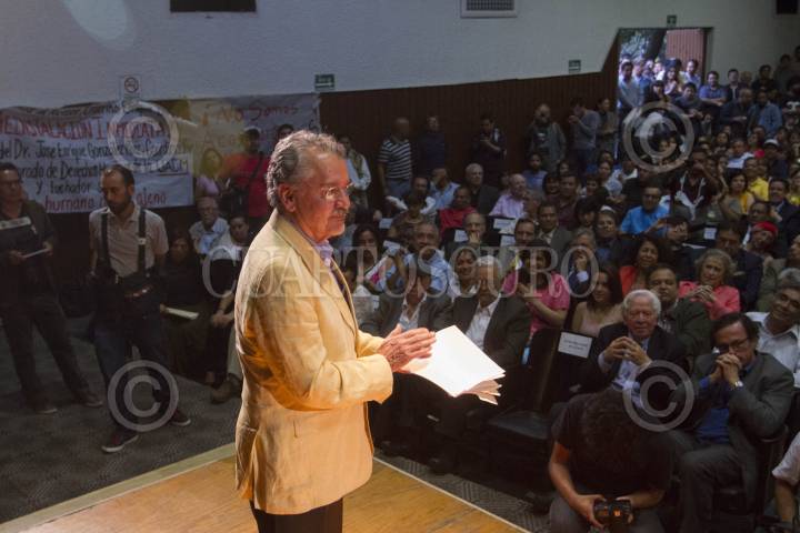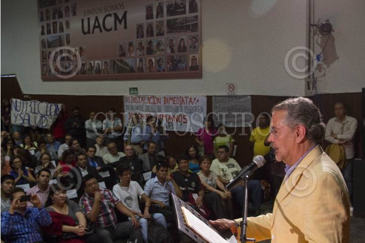MÉXICO D.F., 22MAYO2014- Hugo Aboites Aguilar, acompañado de Enrique Dussel exrector Interino de la Universidad Autónoma de la Ciudad de México (UACM) recibió de parte de Cuauhtémoc Santos Jiménez, del Consejo Universitario., el nombramiento como Rector de la UACM en el auditorio del Plantel Del Valle de está casa de estudios. FOTO: GUILLERMO PEREA /CUARTOSCURO.COM