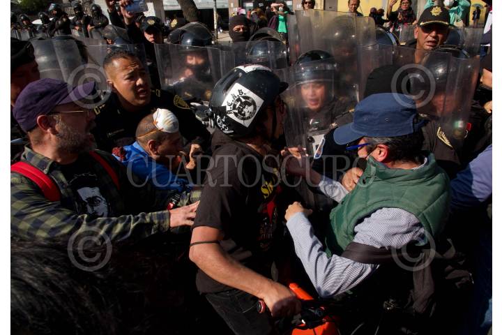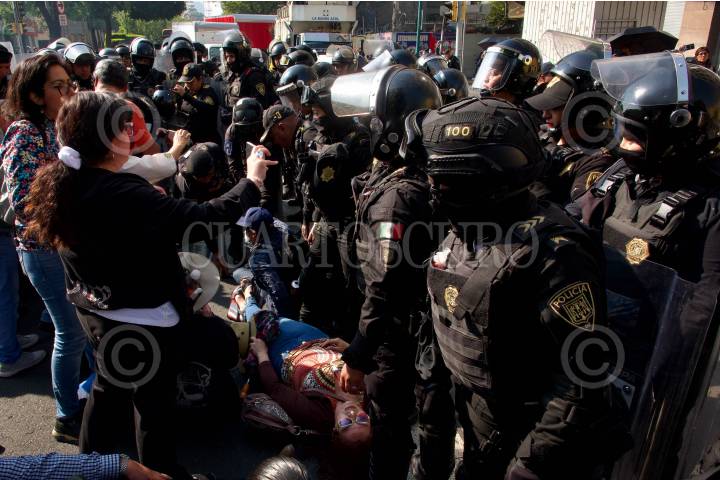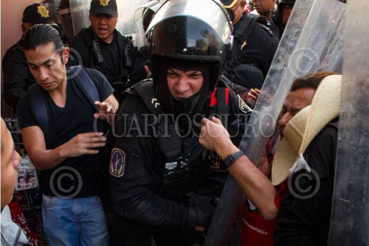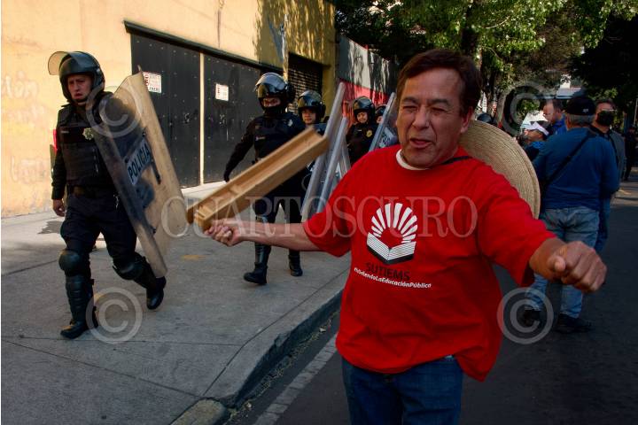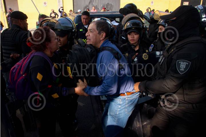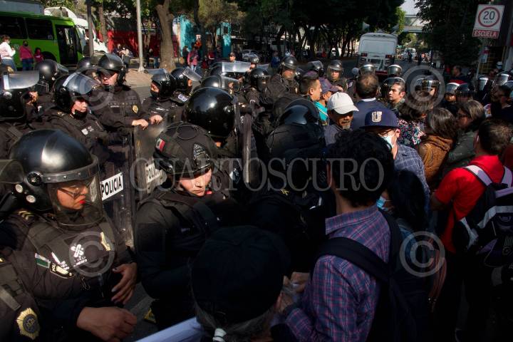 Miembros del SUTIEMS y elementos de la policía capitalina durante repliegue en Avenida Fredy Servando esquina con Bolívar.