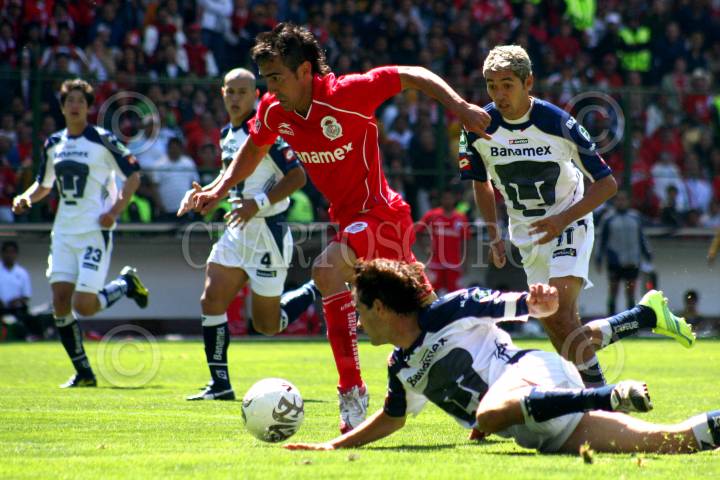 TOLUCA, ESTADO DE MÉXICO, 11FEBRERO2007.- Antonio Sancho, de Pumas, disputa el balón con Carlos Morales, de Toluca, durante el juego en que los Diablos empataron 2-2 con la UNAM. FOTO: ISAAC ESQUIVEL/CUARTOSCURO.COM