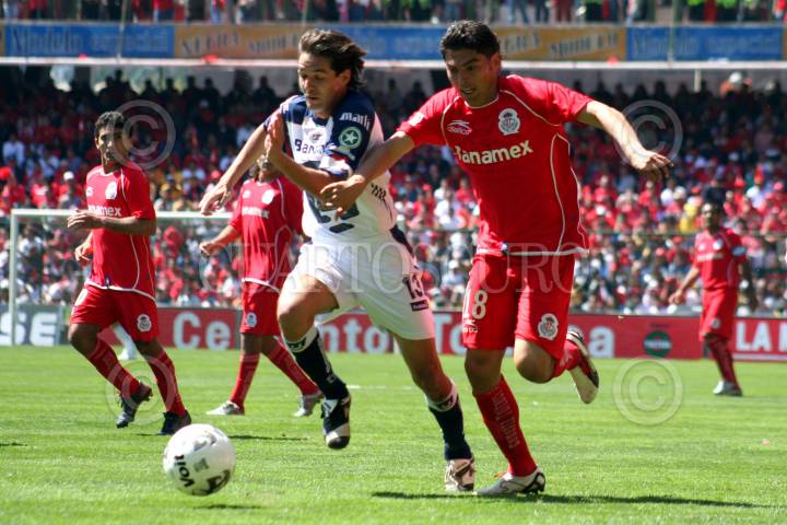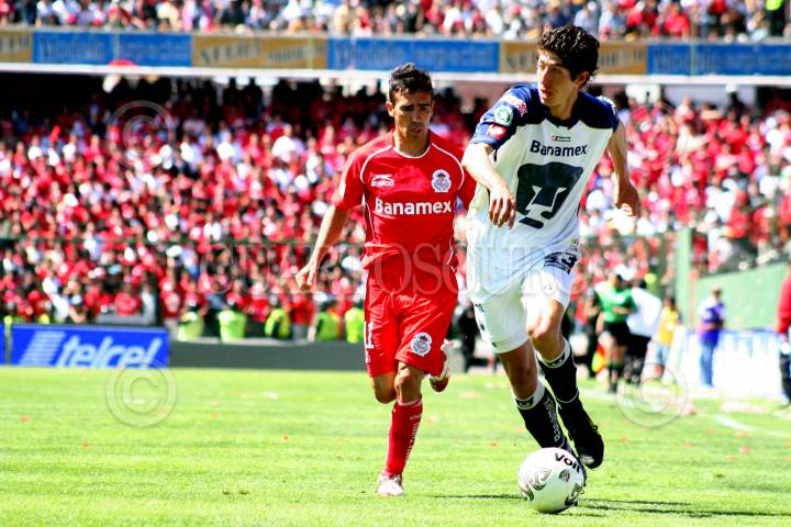 TOLUCA, ESTADO DE MÉXICO, 11FEBRERO2007.- Vicente Sánchez, del Toluca, persigue a Marco Antonio Palacio de Pumas, durante el juego en que los Diablos empataron 2-2 con la UNAM. FOTO: ISAAC ESQUIVEL/CUARTOSCURO.COM