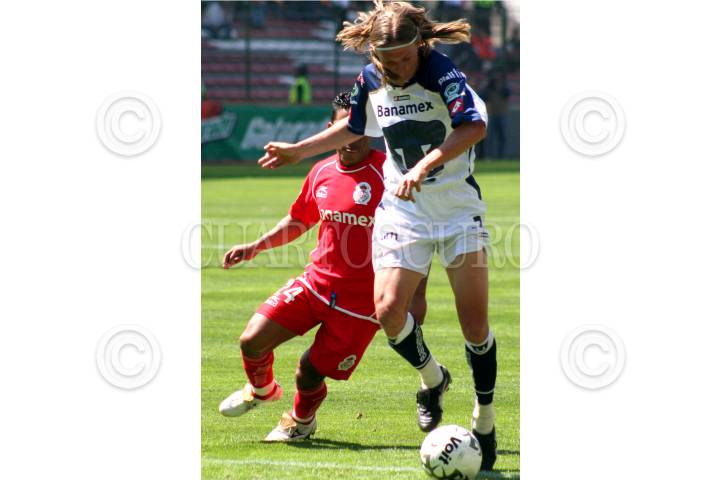 TOLUCA, ESTADO DE MÉXICO, 11FEBRERO2007.- Leandro Augusto de Pumas, se quita la marca de José Manuel Cruzalta, durante el juego en que los Diablos empataron 2-2 con la UNAM. FOTO: ISAAC ESQUIVEL/CUARTOSCURO.COM