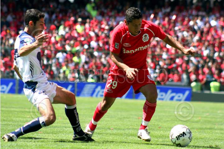 TOLUCA, ESTADO DE MÉXICO, 11FEBRERO2007.- Jehu Chiapas, de Pumas, disputa el balón con Carlos Esquivel, de Toluca, durante el juego en que los Diablos empataron 2-2 con la UNAM. FOTO: ISAAC ESQUIVEL/CUARTOSCURO.COM