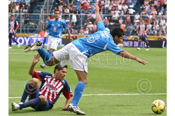 MÉXICO, D.F., 26JULIO2008.- Carlos Bonet del Cruz Azul cae tras una falta de un jugador de las Chivas de Guadalajara en el 1er encuentro del torneo de Apertura 2008 quedando empatado el encuentro a 2 goles. FOTO: RODOLFO ANGULO/CUARTOSCURO.COM