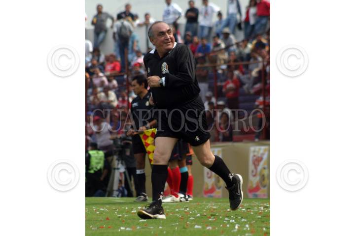 NEZAHUALCOYOTL, EDOMEX, 30JUNIO2007.- Bonifacio Nuñez, arbitro de muchos años de la liga de futbol profesional, fue el encargado de dirigir el partido de homenaje de Antonio Mohamed, entre los Toros de Neza y las Chivas del Guadalajara integradas ambas escuadras por los elementos que alguna vez disputaron una final. FOTO: MOISÉS PABLO/CUARTOSCURO.COM