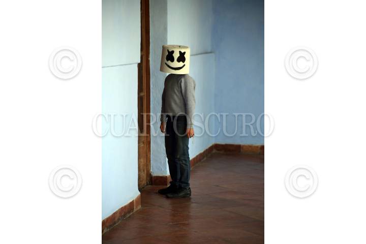 CUERNAVACA, MORELOS, 23SEPTIEMBRE2018.- Un niño con un cubo de agua en la cabeza con ojos y una sonrisa dibujados se pasea por un pasillo del Jardín Borda. FOTO: MARGARITO PÉREZ RETANA /CUARTOSCURO.COM