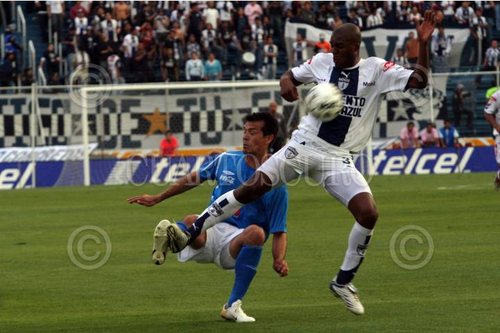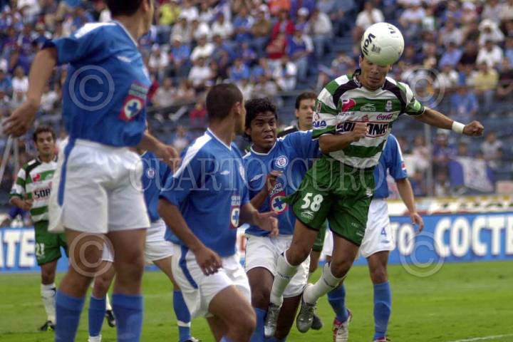 Jared Borgetti, de Santos Laguna, gana un cabezazoa Melvin Brown, de Cruz Azul, durante el partido disputado en el estadio Azul. En este encuentro la máquina perdió con 2 goles por 0. Este es primer partido que Cruz azul pierde en la temporada. FOTO: Juan Pablo Zamora/CUARTOSCURO.COM