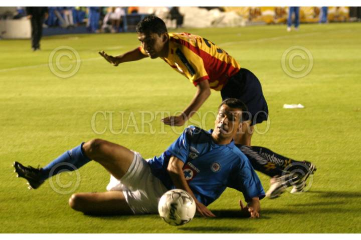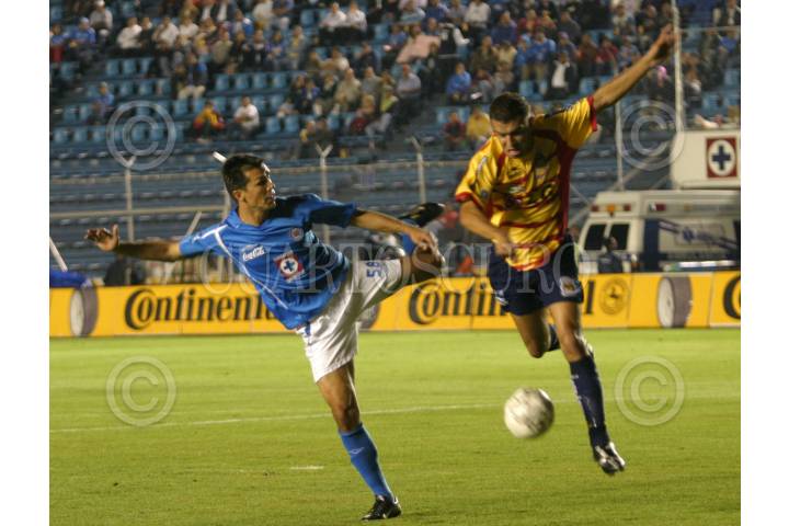 MÉXICO, D.F., 14MARZO2007.- Jared Borguetti, delantero del Cruz Azul se disputa un balón con un defensa de los Monarcas de Morelia, durante el juego de entre ambas escuadras en el estadio Azul. FOTO: MOISÉS PABLO/CUARTOSCURO.COM