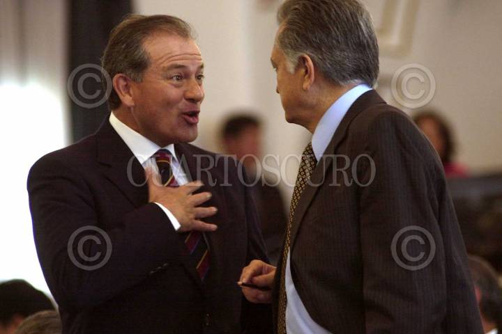 Los legisladores priístas, Genaro Borrego y Manuél Bartlett, conversan en la sesión ordinaria del Senado. FOTO: Victoria Valtierra/CUARTOSCURO.COM