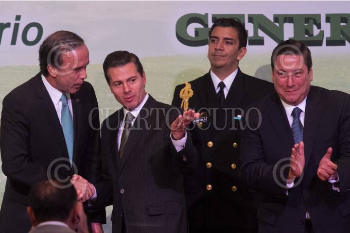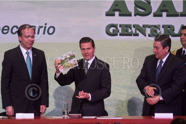 CIUDAD DE MÉXICO, 08MAYO2018.- Bosco de la Vega, líder del Consejo Nacional Agropecuario (CNA); Enrique Peña Nieto, Presidente de México, y Baltazar Hinojosa Ochoa, titular de la Sagarpa, durante la Asamblea Ordinaria del Consejo Nacional Agropecuario. FOTO: MOISÉS PABLO /CUARTOSCURO.COM