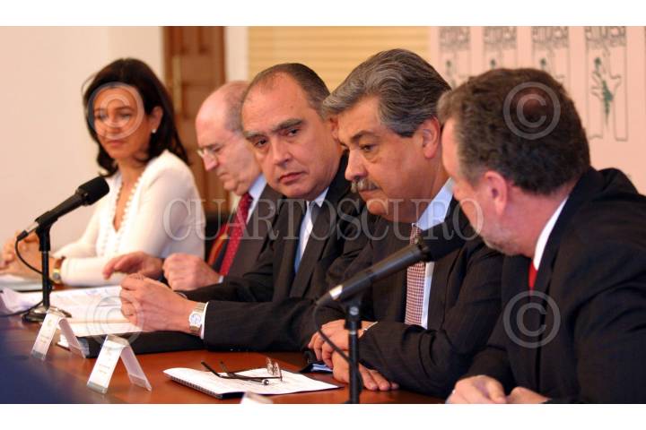 México, D.F. 01 ABRIL 2004.- Ana Patricia Botín, y Abel Matutes, vicepresidente y presidente de la Fundación Empresa y Crecimiento respectivamente, Fernando Canales Clariond, secretario de Economía y Rodolfo Elizondo, secretario de Turismo durante la conferencia de prensa realizada en el salón Venustiano Carranza luego de sostener una reunión con el presidente Vicente Fox. FOTO: Sandra Perdomo/CUARTOSCURO.COM