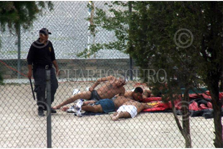 Cd. Juarez, Chihuahua 29 Abril 2004.- En medio de las mallas del interior del Cereso local se ve aun grupo de reos ya inmovilizados luego de que fuera controlada la refriega que se suscito al interios del penal de esta ciudad fronteriza entre integrantes de las bandas los Aztecas y los Mexicas, quienes se disputaban el control de la venta de drogas al interior del cereso local. FOTO: J. Guadalupe Pérez/CUARTOSCURO.COM