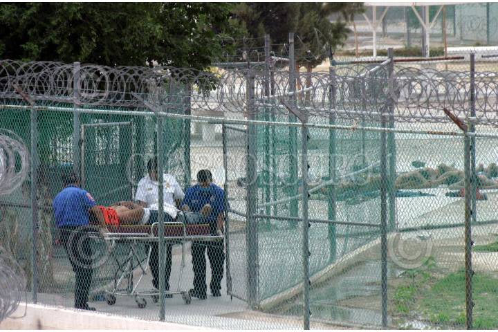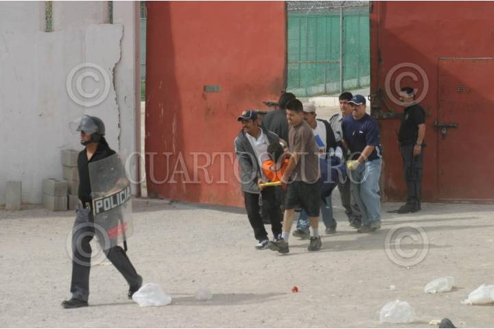 Cd. Juarez, Chihuahua 29 Abril 2004.- Un reo es trasladado en camilla luego de que resultara lesionado en la refriega que se suscito al interios del penal de esta ciudad fronteriza entre integrantes de las bandas los Aztecas y los Mexicas, quienes se disputaban el control de la venta de drogas al interior del cereso local, en el que en menos de 48 hrs han ocurrido dos rinas del mismo tipo. En los hechos perdio la vida Ricardo Pulido, reo que fue tomado como rehen. FOTO: J Guadalupe Pérez/CUARTOSCURO.COM