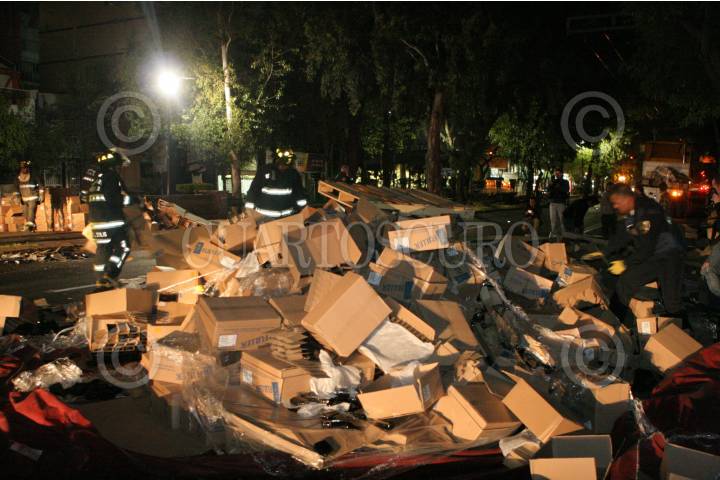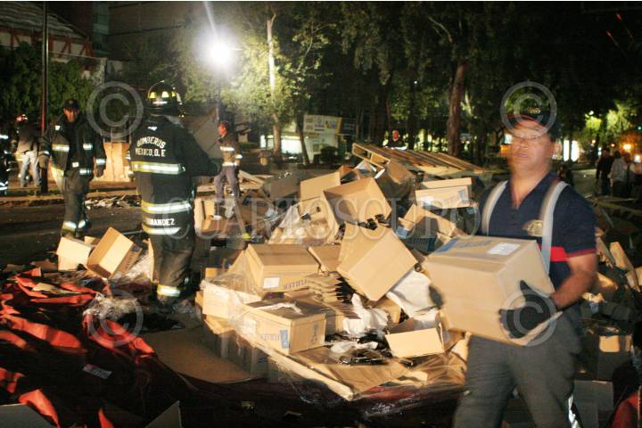 MÉXICO, D.F., 31MARZO2010.- Esta madrugada lucía así lucia el cruce de la avenida Álvaro Obregón y Huichapan en la colonia Roma debido a que a un camión se le cayó el cargamento que transportaba y erase le cayó la carga a un camión que transportaba, botellas de perfume vacías. FOTO: LUZ ACEVEDO/CUARTOSCURO.COM