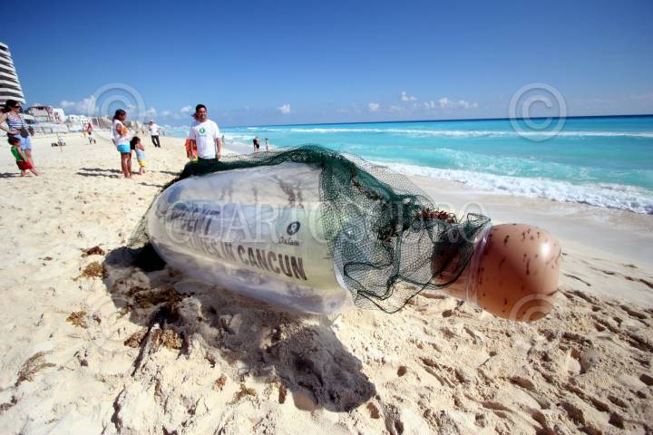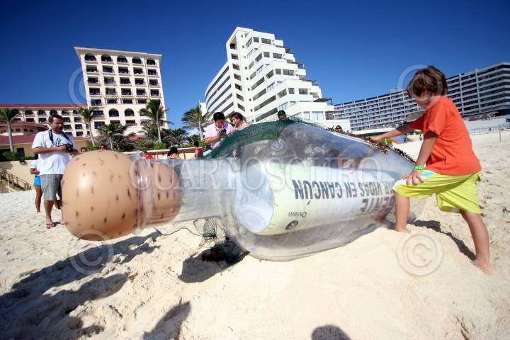 CANCÚN, QUINTANA ROO, 28NOVIEMBRE2010.- Un mensaje en una botella para los representantes de los países que participarán en la Cumbre de Cambio Climático fue colocado por ONGS en la playa. FOTO: AMARANTA PRIETO/CUARTOSCURO.COM