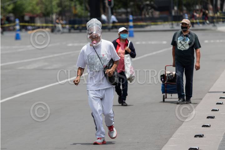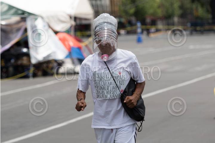 Un hombre con una improvisada careta elaborada con una botella de plástico trota alrededor del zócalo con un mensaje de aliento al personal médico.