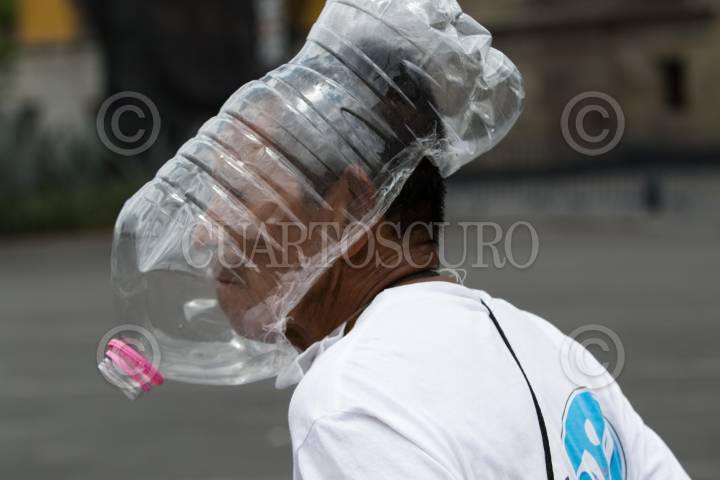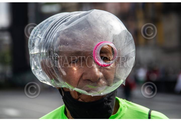 “Basurin Juanito” posa con su envase de garrafón de agua como protección para prevenir el contagio de COVID-19 mientras camina por las calles del Centro Histórico