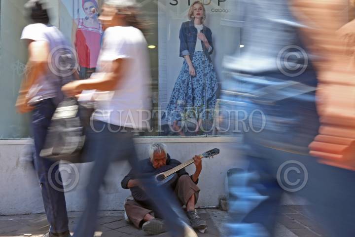 GUADALAJARA, JALISCO, 12ABRIL2019.- Una persona invidente y de la tercera edad se gana la vida tocando la guitarra y cantando melodías, esto a las afueras de una boutique ubicada en las calles de Corona casi esquina con Madero en el centro de la ciudad. FOTO: FERNANDO CARRANZA GARCIA / CUARTOSCURO.COM