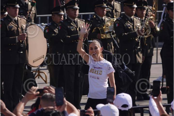 CIUDAD DE MÉXICO, 06ABRIL2025.- Claudia Sheinbaum, presidenta constitucional de los Estados Unidos Mexicanos, durante su llegada a la Clase Nacional de Boxeo realizada en el Zócalo capitalino, la cual convocó a miles de personas. FOTO: GRACIELA LÓPEZ/CUARTOSCURO.COM