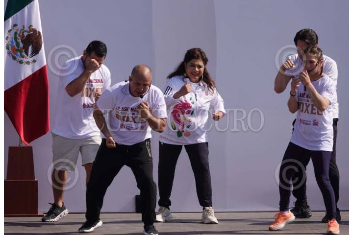 CIUDAD DE MÉXICO, 06ABRIL2025.- Claudia Sheinbaum, presidenta constitucional de los Estados Unidos Mexicanos, motivo a la población a realizar una actividad física durante la Clase Masiva de Boxeo realizada en el Zócalo capitalino. FOTO: GRACIELA LÓPEZ/CUARTOSCURO.COM