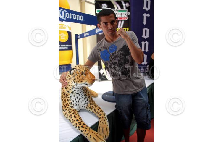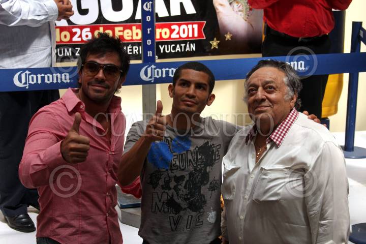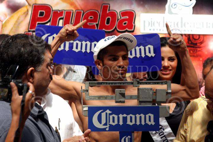 MERIDA, YUCATÁN, 25FEBRERO2011.- Gilberto Keb Baas y Antonio el "Jaguar" Aguirre libraron la báscula en la ceremonia de pesaje, previa a la "Prueba de Fuego" combate en el que el yucateco defenderá por primera ocasión su centro minimosca del Consejo Mundial de Boxeo. FOTO: FRANCISCO BALDERAS/CUARTOSCURO.COM