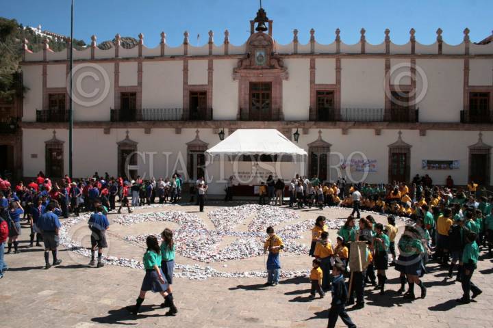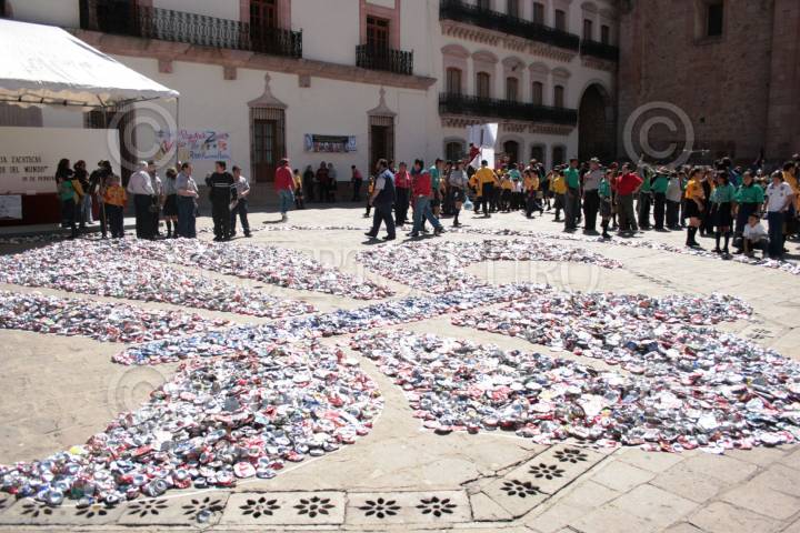 ZACATECAS, ZACATECAS 18FEBRERO2007.- En la plaza de las armas de esta ciudad grupos de boys scouts realizaron una flor de Liz con aproximadamente 36 mil latas de aluminio. FOTO: GUILLERMO MORENO/CUARTOSCURO.COM