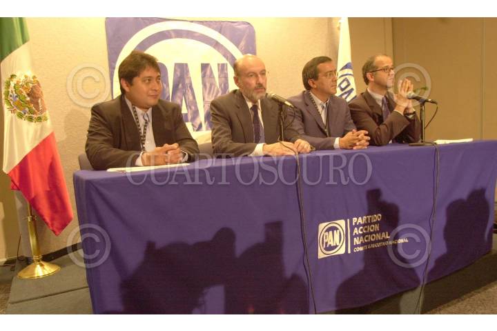 MEXDF18MAYO2004.- En conferencia de prensa el presidente nacional del PAN Luis Felipe Bravo Mena (al centro) mencionó que no existe ningún complot en contra del jefe de gobierno del D.F. FOTO: Eunice Adorno/CUARTOSCURO.COM