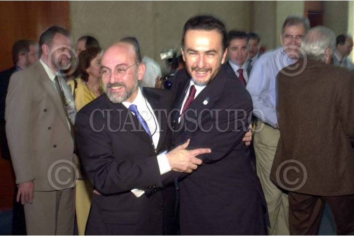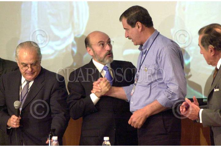 Luis Felipe Bravo Mena recibe la felicitación del presidente Vicente Fox quien acudió a la sede del PAN como consejero del partido. FOTO: Pedro Mera/CUARTOSCURO.COM