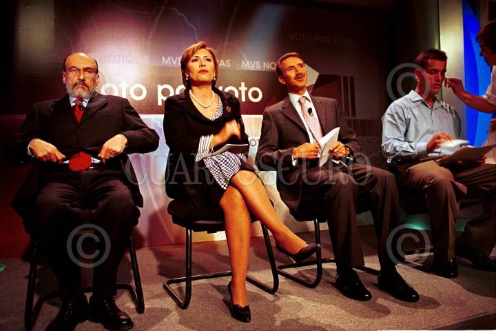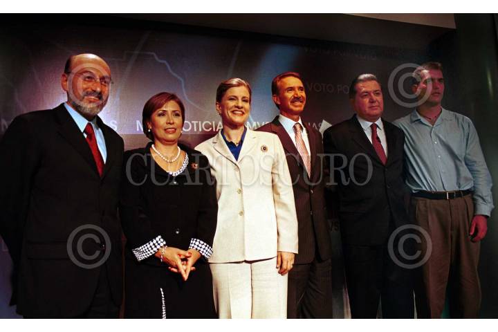 Luis Felipe Bravo Mena, Rosario Robles, Roberto Madrazo y Jorge Emilio González, posan con los conductores del programa " Voto por Voto", para la foto del recuerdo. FOTO: Sandra Perdomo/CUARTOSCURO.COM
