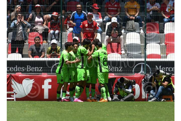 Jugadores de Bravos de Juárez festejan el triunfo ante los Diablos de Toluca durante el encuentro de la jornada 3 del Torneo Apertura 2023.
