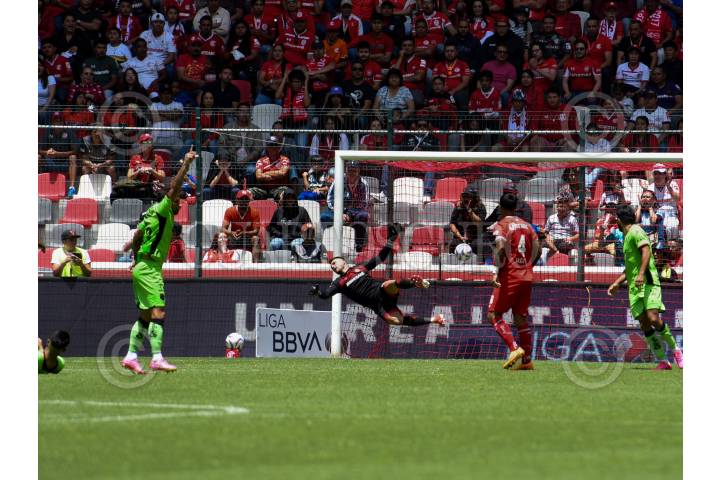 Oscar Ortega defensa de Bravos de Juárez y Tiago Volpi portero de los Diablos de Toluca durante el encuentro de la jornada 3 del Torneo Apertura 2023.