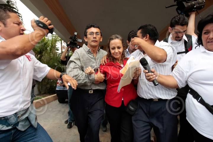 CANCÚN, QUINTANA ROO, 06MARZO2009.- Patricia Seoane de Bretón, directora del albergue infantil La Casita de Cancún, ofreció una rueda de prensa en un hotel de la zona centro de esta ciudad, que terminó en un encontronazo verbal con algunas de las madres de familia, quienes la acusan de haberles robado a sus hijos e hijas, bajo engaños. Para eludirlas la activista se resguardó en el sanitario y terminó por salir huyendo con ayuda de su equipo. FOTO: AMARANTA PRIETO/CUARTOSCURO.COM