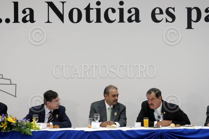 México, D.F., 11JUNIO2004.- Vicente Fox Quesada, presidente de la República, encabezó la ceremonia del Día de los Voceadores, lo acompañaron Guillermo Vela Briones, secretario de la Unión de Voceadores de los Periodicos y José Gutierrez Vivo, periodista y empresario. FOTO: Moisés Pablo/CUARTOSCURO.COM