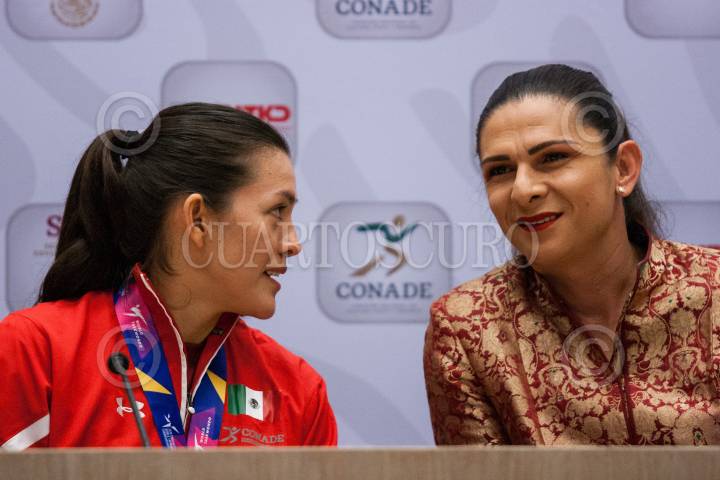 CIUDAD DE MÉXICO, 21MAYO2019.- María del Rosario Espinoza, medallista de plata en el mundial de Taekwondo de Manchester 2019, y Ana Gabriela Guevara, directora general de la Comisión Nacional de Cultura Física y Deporte (CONADE), durante la conferencia de prensa para dar detalles de la participación de la selección mexicana de Taekwondo antes dicho campeonato. FOTO: GALO CAÑAS /CUARTOSCURO.COM