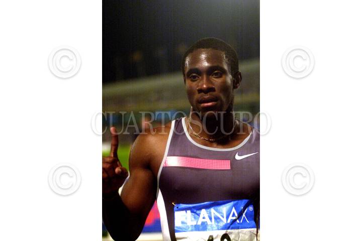 MEXDF22MAYO.- Darrel Brown de Trinidad y Tobago saluda a la prensa después de haber ganado la prueva de 100 metros planos en la Gran Prix. FOTO:Eunice Adorno/CUARTOSCURO.COM