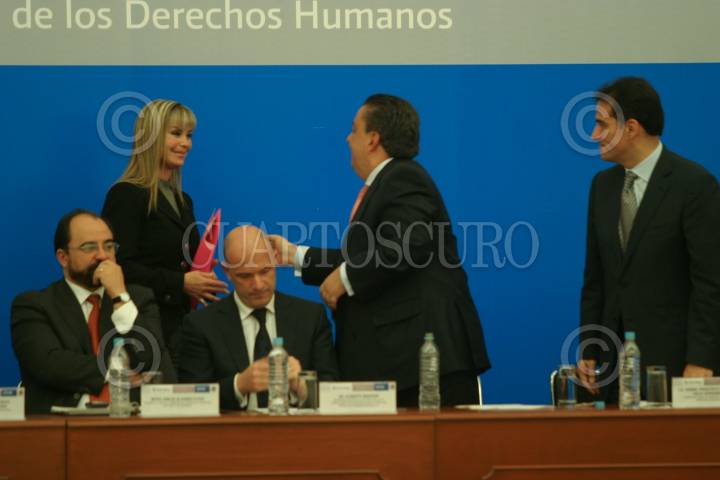 MÉXICO, D.F., 10DICIEMBRE2008.- Emilio Álvarez Icaza Titulade de Derechos Humanos, Alberto Bruni Representante de la oficina de alto comisionado de Naciones Unidas para los Derechos Humanos en México, Fernando Gomez Mont Secretario de gobernación, saluda a la actiz Gabriela Goldschmied durante la presentación del programa Nacional de Derechos Humanos 2008-2012 FOTO: SÁSHENKA GUTIÉRREZ/CUARTOSCURO.COM